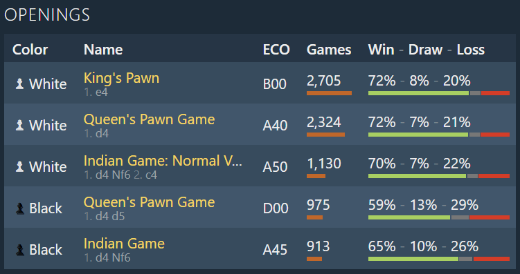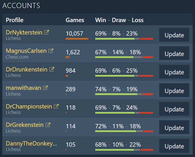 Merge your Chess.com and Lichess.org accounts together and view statistics for all of your games at once.